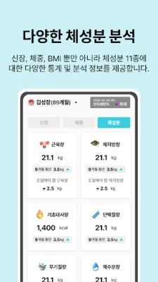 체중, 신장, BMI, 체지방률, 근육량 등 다양한 체성분 항목을 시각화해 보여줍니다.